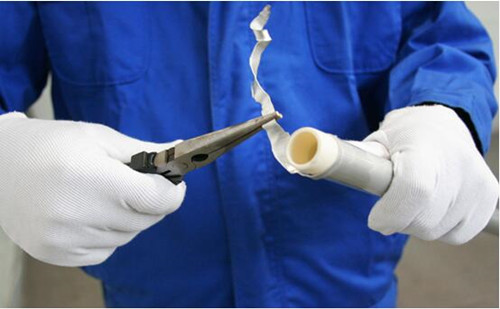 步驟四:去掉鋁合金層(céng):采用鉗子等輔助工具將管材端頭切開的鋁合金層去(qù)掉。
