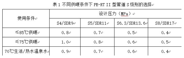 由以上表可(kě)以看出,PE-RT II型管道一般選用S5係列即可滿足小區集中供暖管網的(de)運(yùn)行溫(wēn)度、1、壓力要求