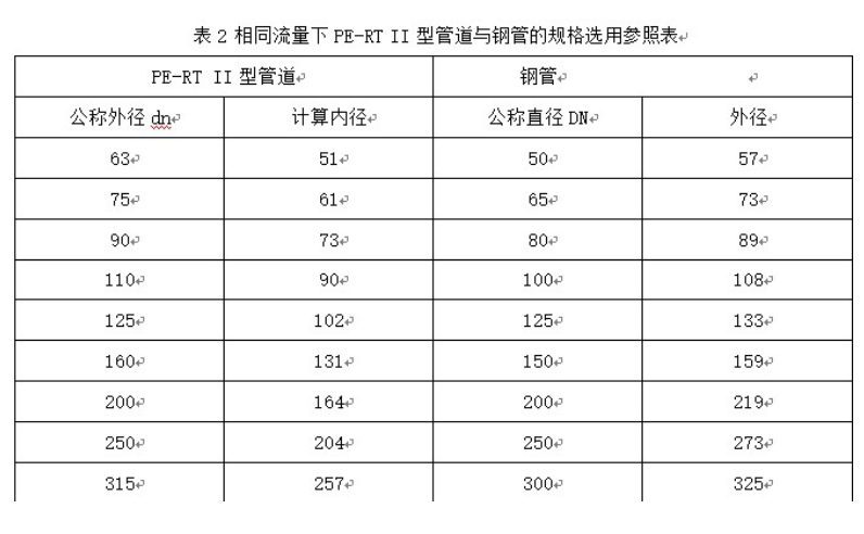 與鋼管比較,PE-RT II型管道的摩擦阻力小(xiǎo),同樣內徑的管(guǎn)材流量是鋼管的1.25倍,隨著鋼管的腐蝕,內壁會變(biàn)得更加粗糙,流(liú)量(liàng)也會逐年降低(dī),相同流量的情(qíng)況(kuàng)下,PE-RT II型管道與鋼管的規格選型見表2
