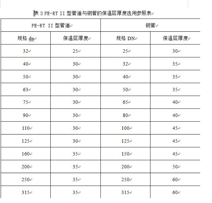 PE-RT II型供熱管道與鋼管相同,都采用工作管、保溫層、外護管三位一體的保溫結構,由於PE-RT II型材料的導熱係數為鋼管的1%,即管材本身具有(yǒu)較好的保溫性能,且(qiě)PE-RT II型管道、保溫層、外(wài)護管的熱膨脹係(xì)數基本一致,會成為一個整體,不易分層(céng)、脫落,管道保溫效果優於鋼管,在相同(tóng)的外界溫度條件下,更節約(yuē)保溫材料。以輸送80℃熱水(shuǐ)為例(lì),相(xiàng)同流量的外界溫(wēn)度下,PE-RT II型管道與鋼管的(de)保溫層厚度選型見表3
