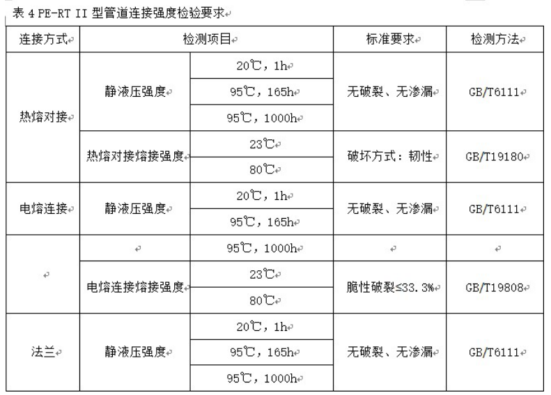 PE-RT II型管材、管件參照GB/T28799-2012執行,管道連接強度要求詳(xiáng)見表4
